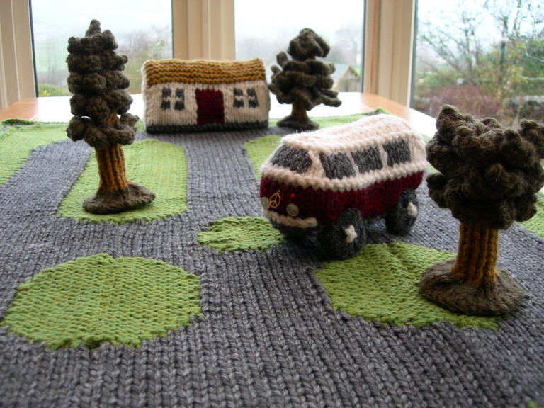 You’ll also need a pair of 6mm knitting needles, toy filling, cardboard (cottage and tree bases), paper (tree trunks), felt (tree bases/campervan lights) and beads/buttons (if you’d rather use those for campervan lights!).